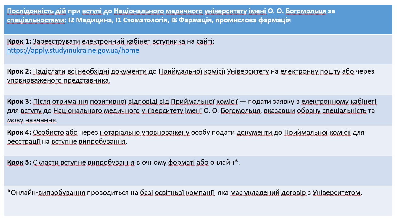Відповідно до Правил прийому на навчання для здобуття вищої освіти у Національному медичному університеті імені О.О. Богомольця, прийом заяв та зарахування іноземних громадян на 1-й курс триватиме з 19 липня 2025 року по 31 жовтня 2025 року.